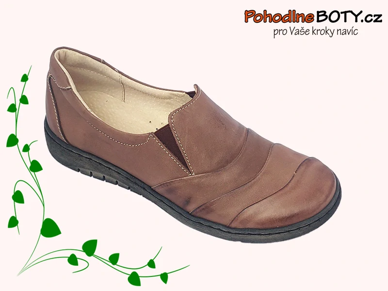 Lehké kožené mokasíny v hnědém odstínu s lehce melírovaným nádechem. Mokasíny jsou velmi pohodlné, po bocích mají gumičky pro snadnější obouvání. Mokasíny se stanou vaším příjemným společníkem nejen při procházkách a výletech. Díky švům v přední části nejsou vhodné pro hallux nebo jiné ortopedické p... celý popis